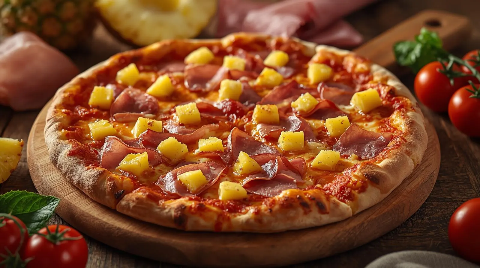 Salsa de tomate, mozzarella, jamón y piña.